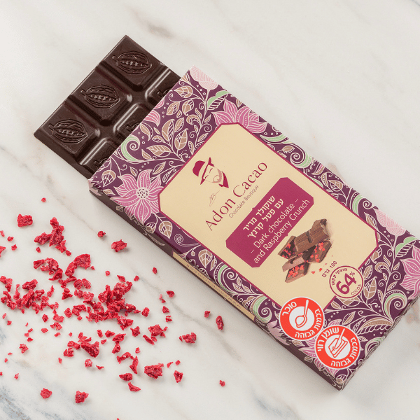 שוקולד מריר 64% עם פטל מיובש בהקפאה.