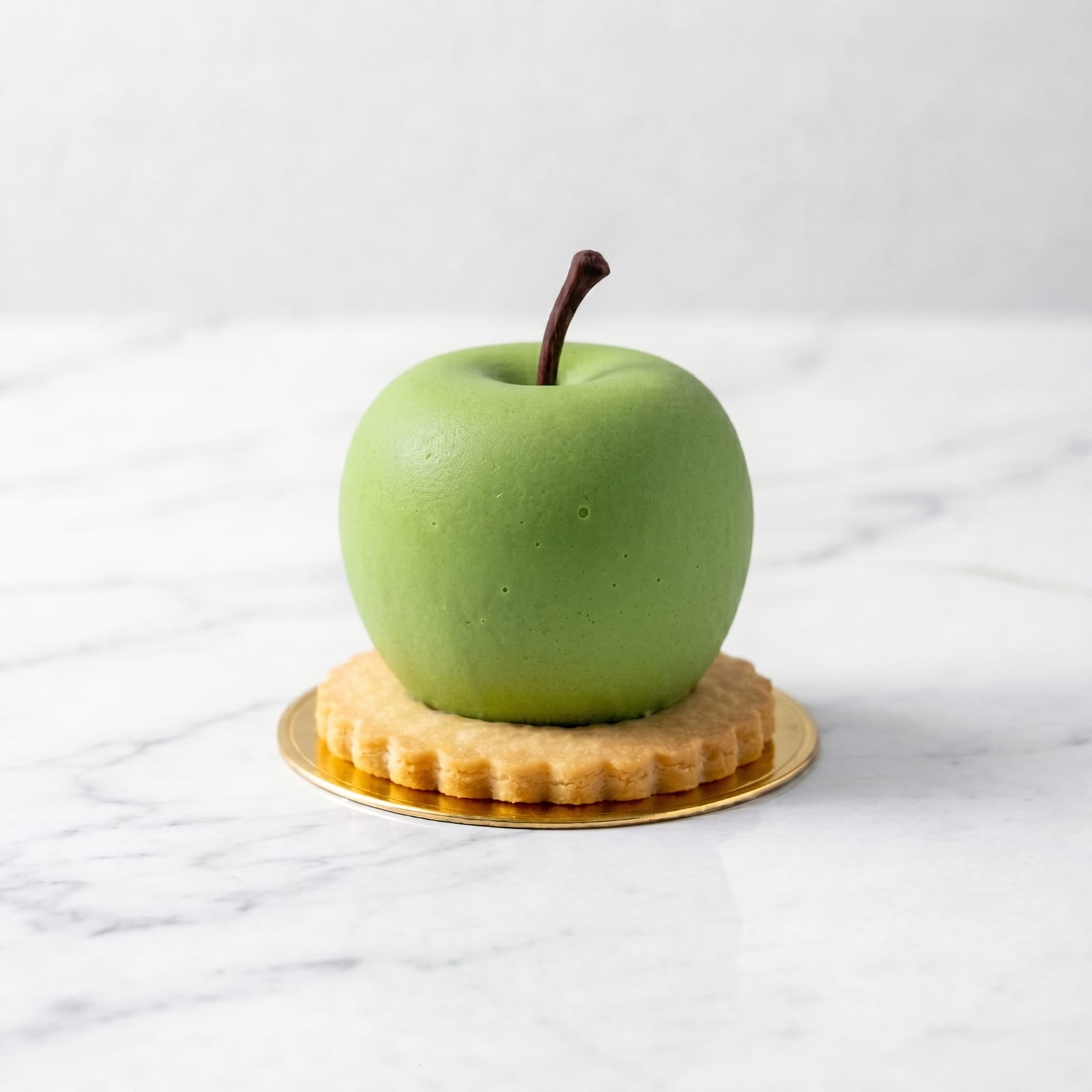 שכבות של מוס תפוח ירוק, קונפי תפוח ירוק עם שמיר טרי וציפוי שוקולד לבן שמאזן את החמיצות.