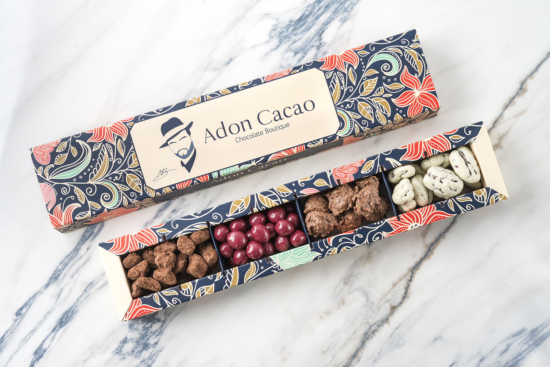 סיגר שוקולד בעבודת יד עשוי משוקולד ג’אנדויה, מחית אגוזי לוז פיימונטה ושבבי וופל קרמל פריך, בציפוי שוקולד מריר70% משובח ואבקת קקאו איכותית.